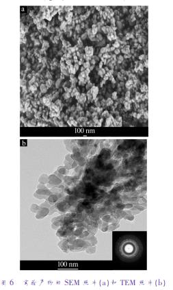 圖6分別為實(shí)驗(yàn)產(chǎn)物的SEM和TEM照片。由圖6a可以看到,粉末為均勻的粒狀產(chǎn)品,無塊狀產(chǎn)物出現(xiàn)。從圖6b可見,產(chǎn)物為粒狀顆粒,大小尺寸均小于100nm,其SAED圖可看到多個(gè)同心圓的衍射環(huán),說明納米磷酸鋅是一結(jié)晶性良好的多晶結(jié)構(gòu)。
